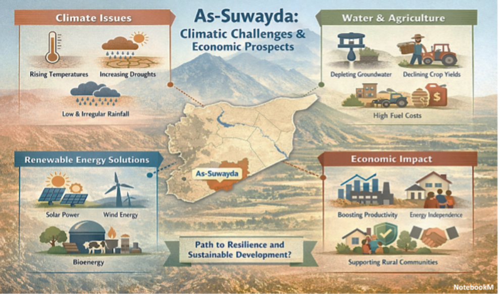 This development is not only technological; it also reflects a deep societal shift—away from central state institutions toward local self‑reliance, economic independence, and the use of sustainable energy models. For a region like As-Suwayda —characterized by high solar irradiation, relatively stable winds on mountain peaks, and agricultural diversity—expanding renewable energy use opens new horizons for resilience, innovation, and greater economic value from local resources.